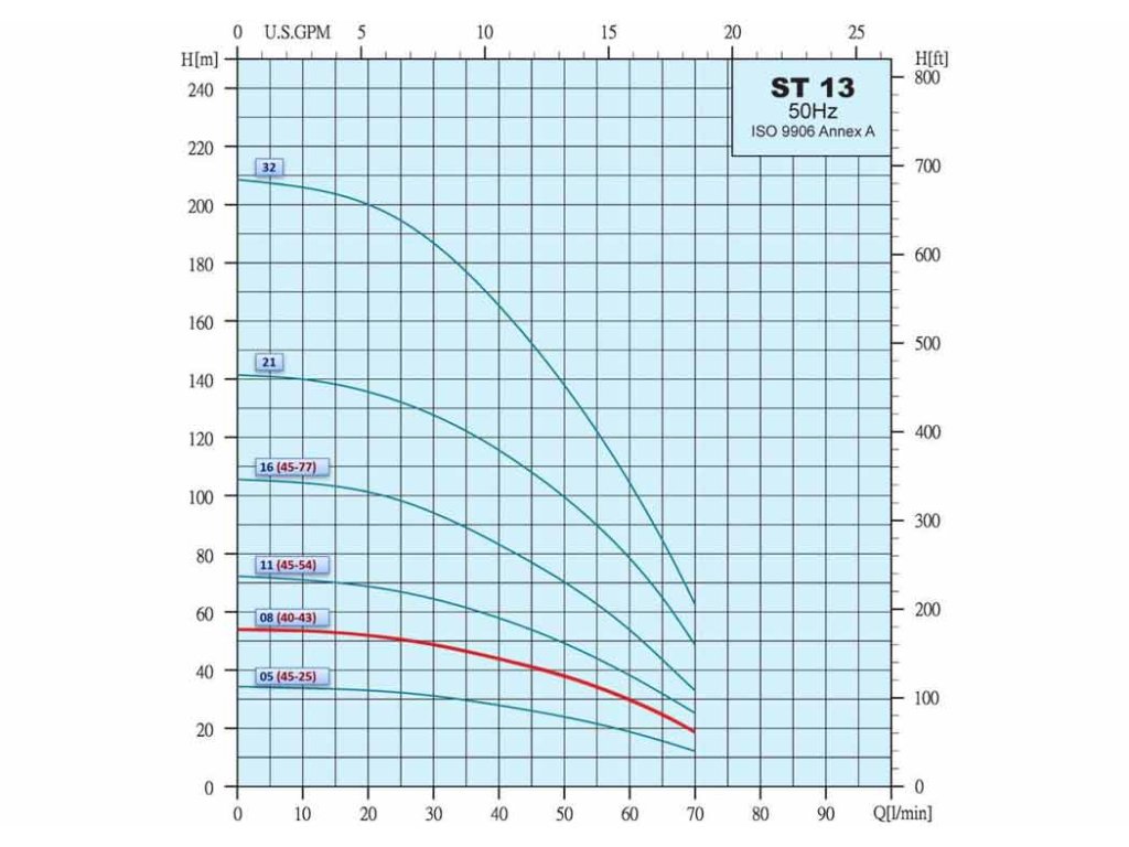 - Ponorné čerpadlo SD 40-43 – výkon 0,55 kW, optimálny prietok 40 l/min pri výtlaku 43 m, nerezové telo AISI 304, plávajúce obežné kolesá z Norylu, odolnosť voči piesku do 150 g/m³, kábel 20 m