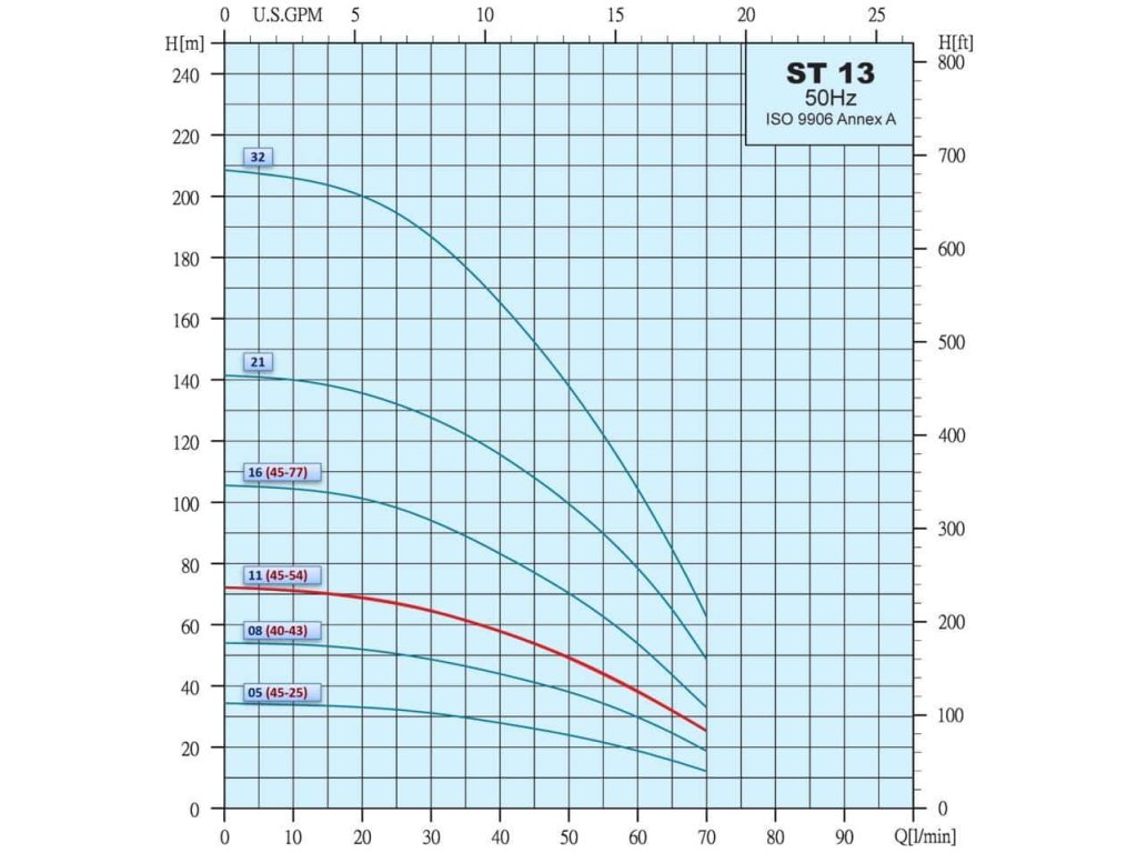 - Ponorné čerpadlo SD 45-54 – výkon 0,75 kW, optimálny prietok 45 l/min pri výtlaku 54 m, nerezové telo AISI 304, plávajúce obežné kolesá z Norylu, odolnosť voči piesku do 150 g/m³, kábel 20 m