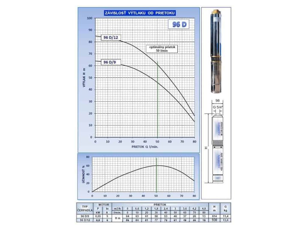 - Optimálny výtlak 61 m a prietok 50–55 l/min