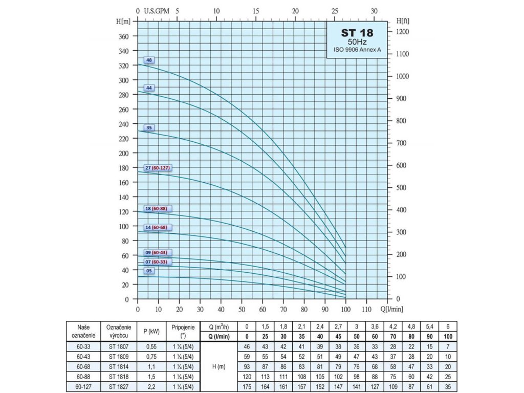 - Optimálny pracovný bod: 60 l/min pri 68 m