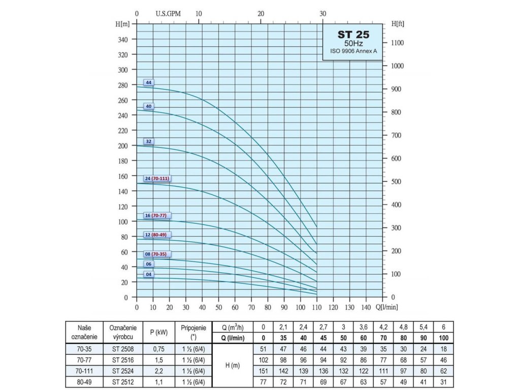 - Optimálny pracovný bod: 80 l/min pri 49 m