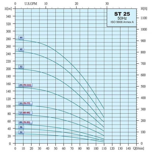 Hydraulika typu ST s plávajúcimi obežnými kolesami z materiálu Noryl zabezpečuje vysokú odolnosť voči piesku až do 150 g/m3. Zväčšené výtlačné hrdlo 1 1/2" (6/4") minimalizuje tlakové straty pri vysokých prietokoch. Celonerezové vyhotovenie z ocele AISI 304 spolu so špeciálnym tesnením umožňuje bezpečný ponor až do 350 m.
