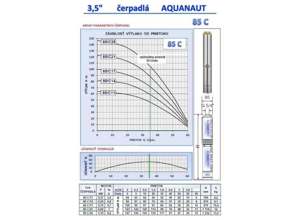 Čerpadlo AQUANAUT 85 C/21 s priemerom 3,5" (85 mm) je určené na čerpanie čistej vody z úzkych a hlbokých vrtov. Je vybavené olejom plneným motorom SD s napätím 230 V a výkonom 0,92 kW. Optimálne pracuje pri výtlaku 76 metrov s prietokom 40 litrov za minútu. Konštrukcia s voľne uloženými obežnými kolesami zabraňuje zadretiu a predlžuje životnosť zariadenia.