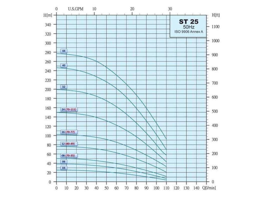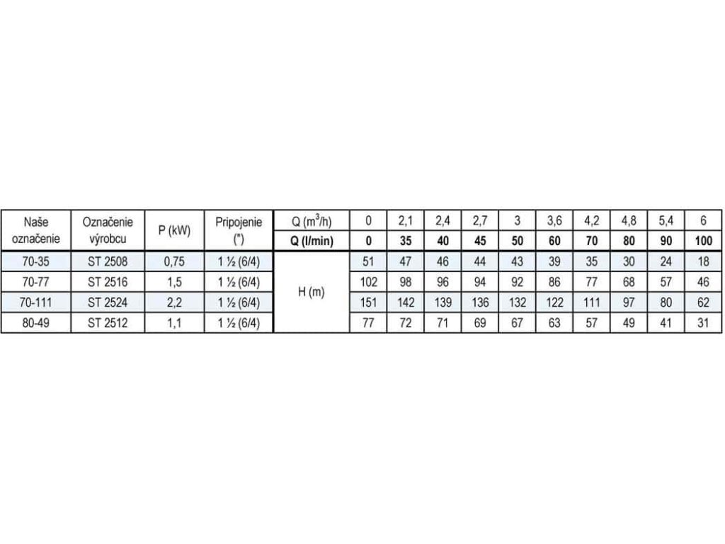 - Optimálny výtlak: 49 m pri prietoku 80 l/min