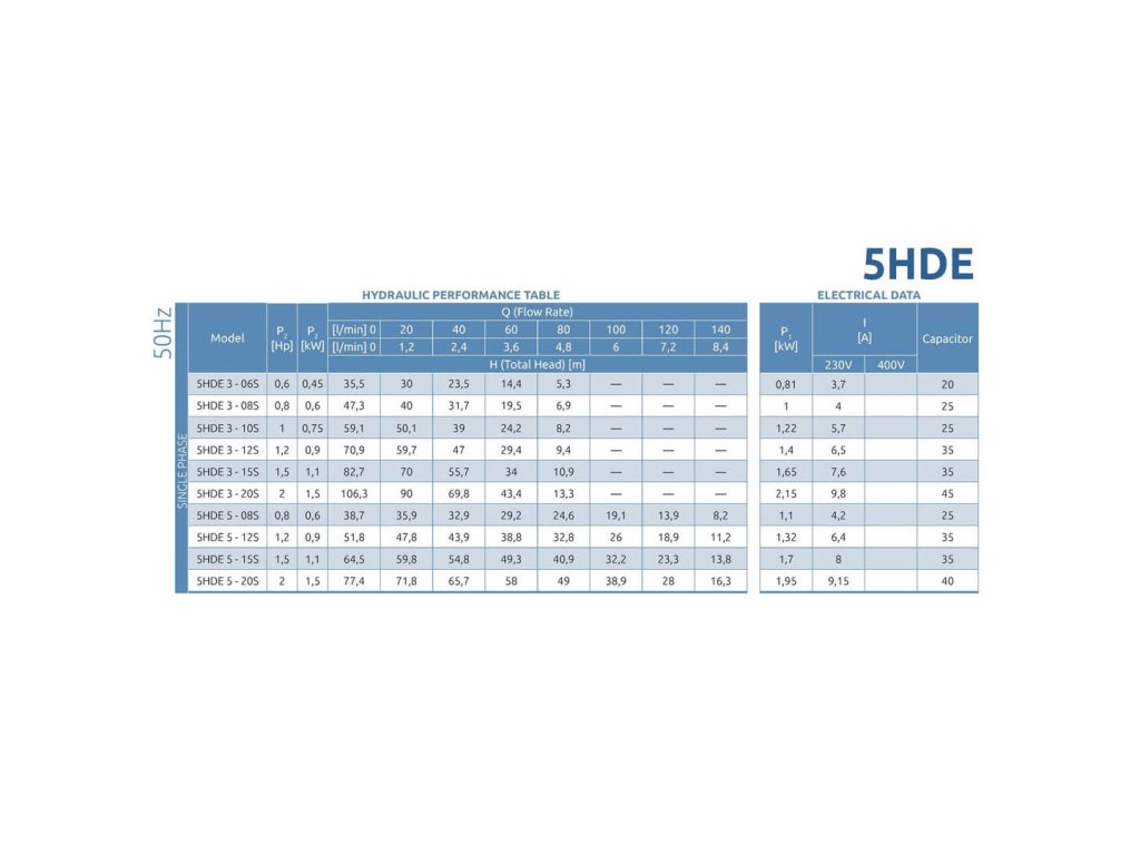 Ponorné čerpadlo HYDROP 5HDE 3-12S je viacstupňové 5" čerpadlo určené na čerpanie čistej vody z kopaných studní, nádrží a širších vrtov od Ø125 mm. Vďaka hydraulike s max. výtlakom 70 m je vhodné aj pre aplikácie, kde je potrebný vyšší tlak v rozvodoch alebo na postrekovačoch.