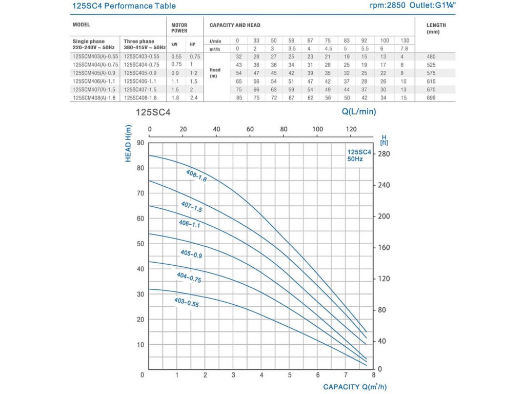 JIADI 125SCM406A je najvýkonnejší model v rade 5" ponorných čerpadiel SCM. Vďaka motoru s výkonom 1,1 kW a zosilnenej hydraulike dosahuje výtlak až 65 m pri zachovaní maximálneho prietoku 130 l/min.