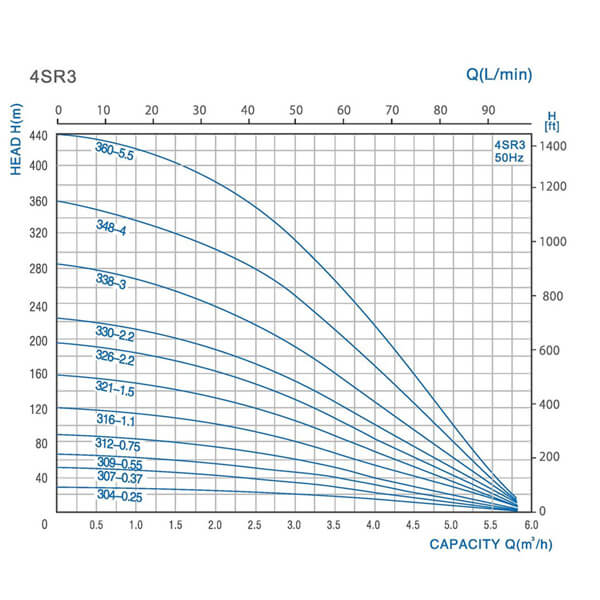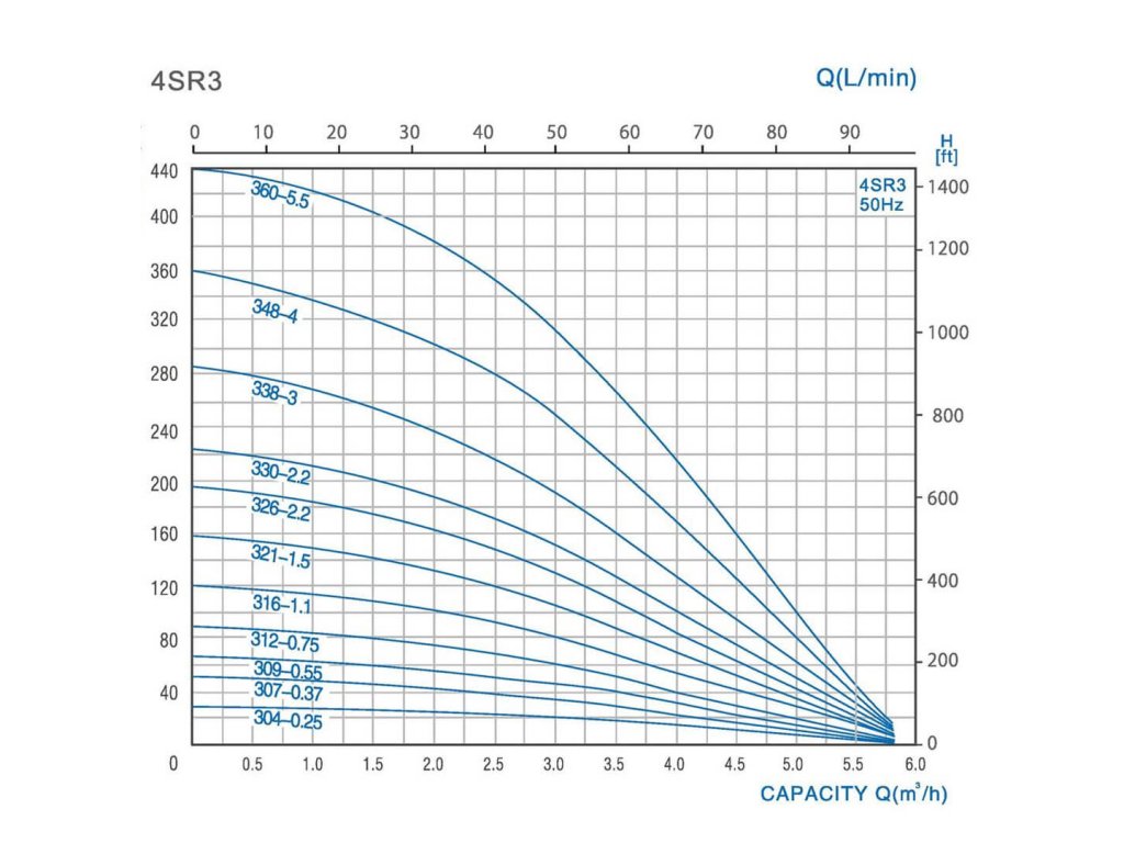 JIADI 4SRM 309 dosahuje max. prietok 67 l/min a max. výtlak 65 m. Pre stabilnú prevádzku je vhodné držať sa odporúčaného bodu 50 l/min pri 42 m.