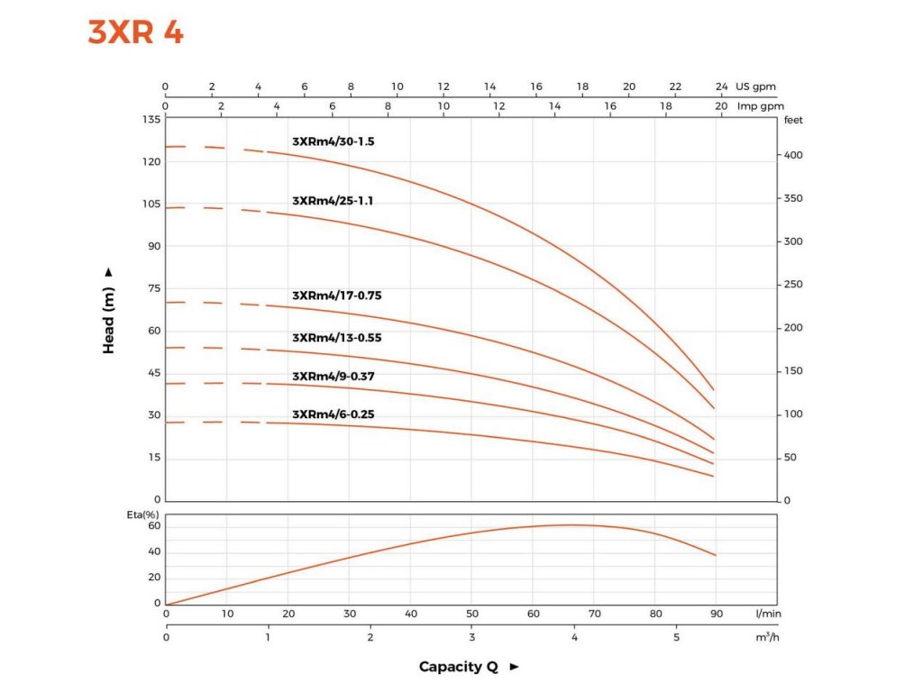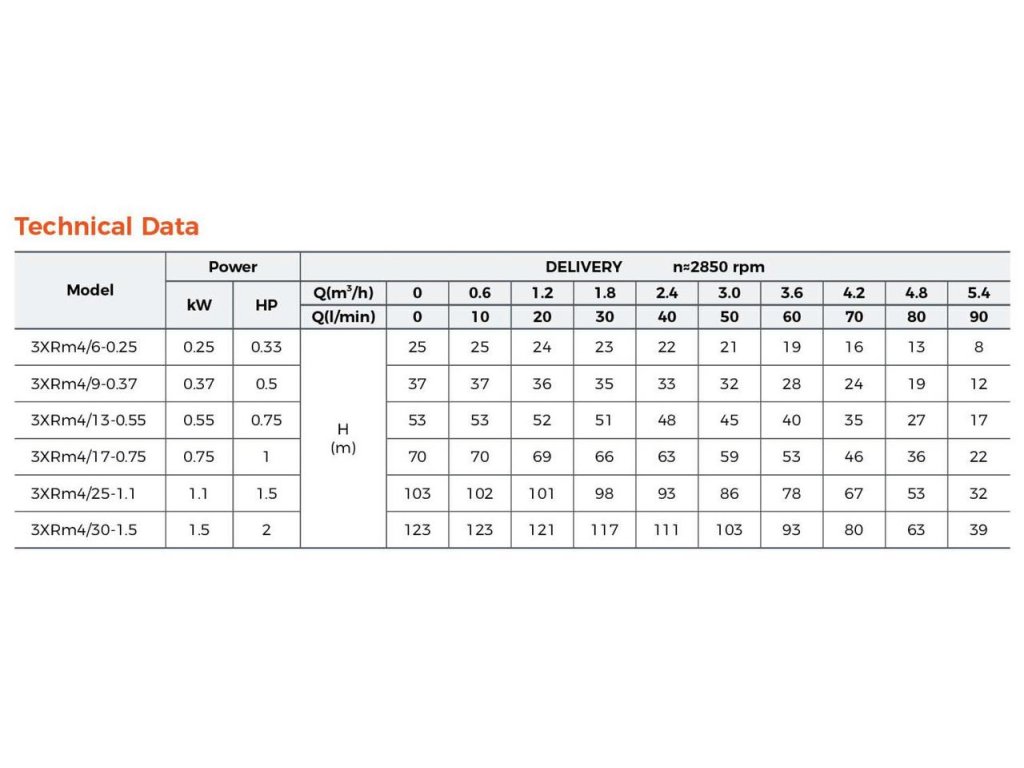 Ponorné čerpadlo LEO 3XRm4/17 predstavuje ideálnu rovnováhu medzi vysokým hydraulickým výkonom a kompaktnými rozmermi. S priemerom iba 75 mm (3 palce) je určené pre inštaláciu do úzkych vrtov, pričom motor s príkonom 0,75 kW dokáže generovať nadštandardný prietok až 90 l/min (5,4 m3/h). Robustná konštrukcia z nehrdzavejúcej ocele AISI 304 a technológia plávajúcich obežných kolies zaisťujú dlhú životnosť a spoľahlivosť aj v náročných podmienkach s výskytom mechanických nečistôt.