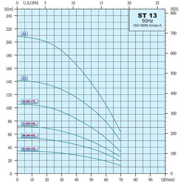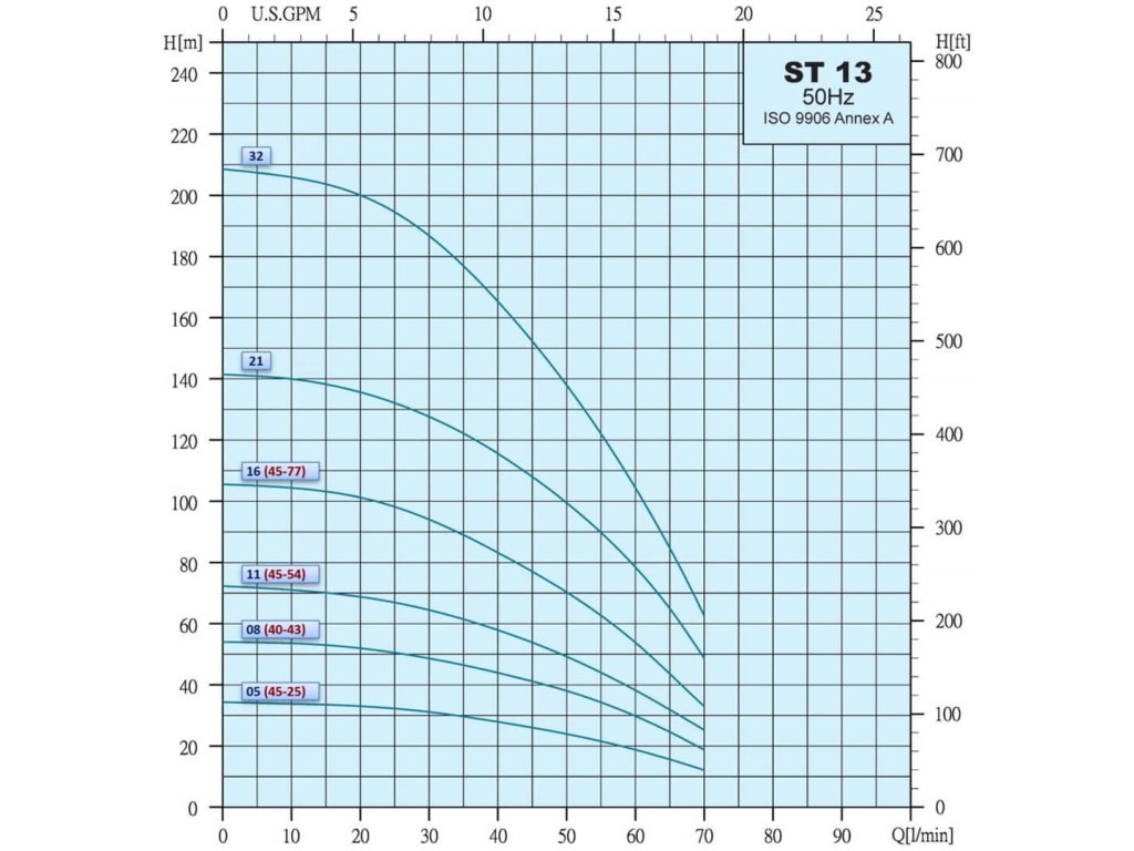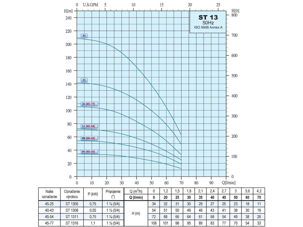Model SD 40-43 dosahuje optimálny pracovný bod pri prietoku 40 l/min a výtlaku 43 m, pričom maximálny výtlak dosahuje 54 m.