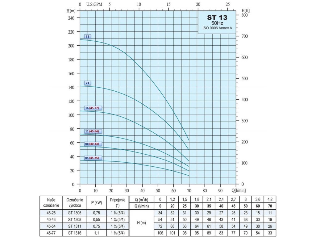 - Optimálny pracovný bod: 45 l/min pri 54 m