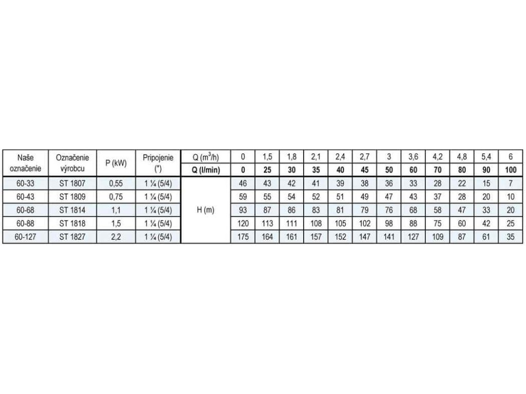 - Optimálny výtlak: 43 m pri prietoku 60 l/min
