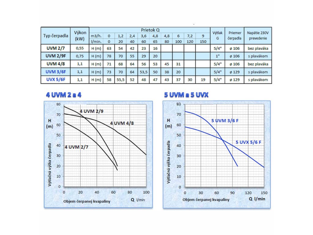 Ponorné čerpadlo UVM 2/9F je viacstupňové 4" monoblokové čerpadlo určené na čerpanie čistej vody z vrtov, kopaných studní, nádrží a vodojemov. Vďaka hydraulike s max. výtlakom 78 m a optimálnemu pracovnému bodu 40 l/min je vhodné pre zásobovanie rodinných domov aj automatické zavlažovanie s vyššími nárokmi na tlak.