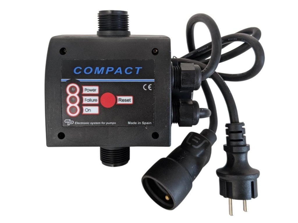 Prietokový spínač COMPACT 2 s káblom je moderné zariadenie na automatické riadenie a ochranu jednofázových odstredivých čerpadiel s príkonom do 1,5 kW. Vďaka integrovanému elektronickému snímaču prietoku a tlaku predstavuje kompaktnú alternatívu k tradičným systémom s tlakovými spínačmi, spätnými ventilmi a hladinovými spínačmi.