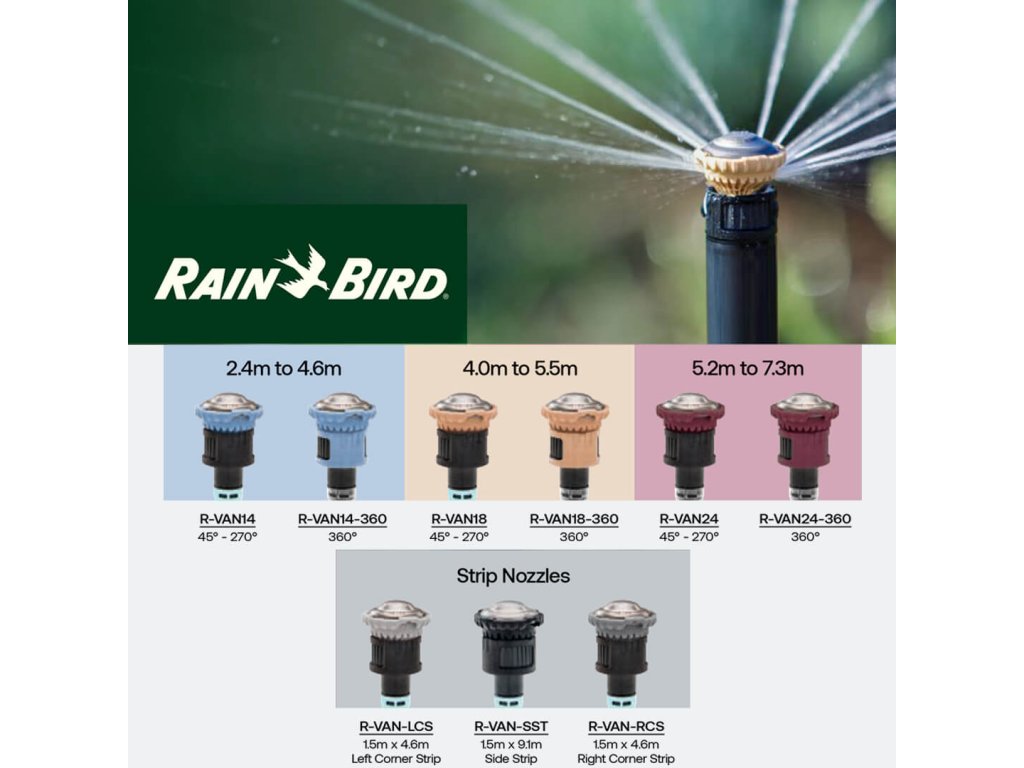 Rotačná tryska Rain Bird R-VAN 18-360 je navrhnutá pre presné a rovnomerné zavlažovanie celokruhových plôch. Disponuje pevným uhlom postreku 360° a maximálnym dostrekom až 5,5 m, vďaka čomu je ideálna pre väčšie trávnikové a záhradné plochy.