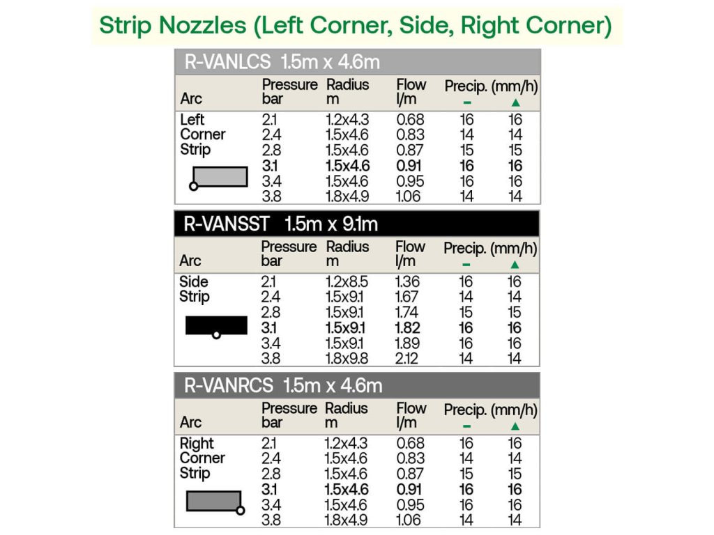 Tryska R-VAN-RCS je navrhnutá na kombinovanie s tryskami R-VAN-LCS (ľavý roh) a R-VAN-SST (stredový pás), čo umožňuje presné a rovnomerné zavlažovanie celých obdĺžnikových plôch bez prekrývania.
