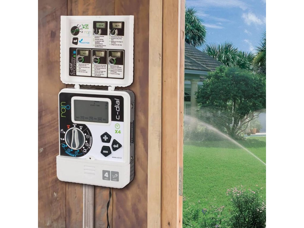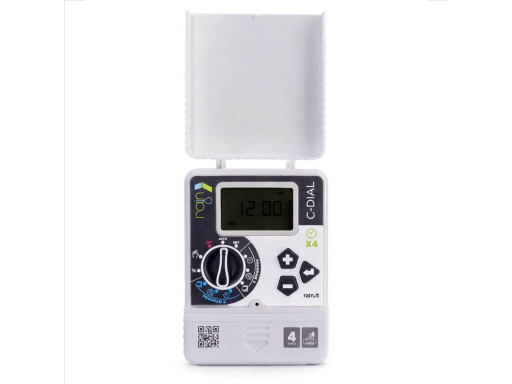 Rain C-Dial 4 je nástenná riadiaca jednotka určená pre menšie rezidenčné závlahové systémy. Ovláda až 4 sekcie (24 V AC elektromagnetické ventily) a umožňuje jednoduché programovanie pomocou otočného voliča.