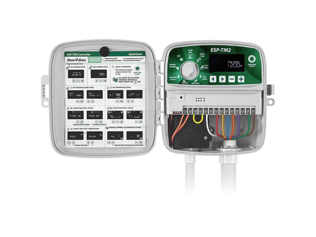 Riadiaca jednotka Rain Bird ESP-TM2 je profesionálne riešenie pre automatické ovládanie zavlažovacích systémov s 12 nezávislými závlahovými sekciami. Je určená pre vonkajšiu inštaláciu a osadená v odolnej plastovej skrinke s dverami a krytím IP24.
